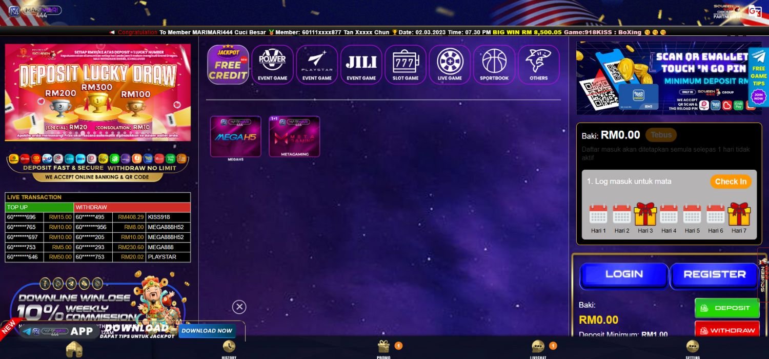 • New Member Register Free: On creating a fresh account, every new member gets a RM20 free credit on MegaH5 slots. Besides, the maximum and minimum possible withdrawals on this offer are 5% and RM600, respectively.